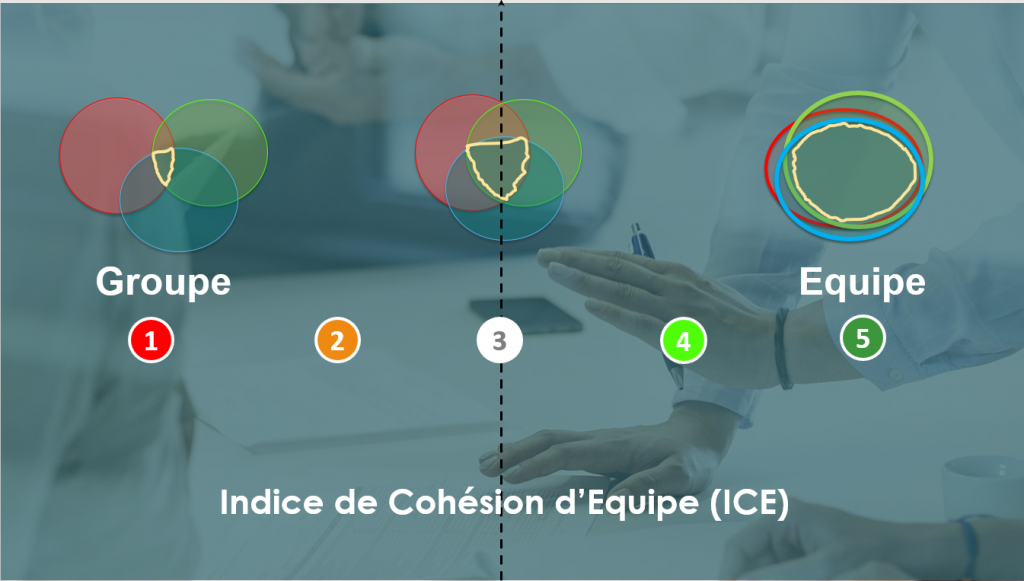 Avec le ID-PMC canvas, vous calculez le niveau de cohésion de votre équipe grâce à la FICHE DE COHESION qui vous donne un indicateur appelé INDICE DE COHESION (ICE) sur une échelle de 1 à 5Lorsque votre ICE est inférieur à 3, cela signifie que vous avez un groupe, vous n’avez pas encore atteint le niveau équipe. Un indice de cohésion de 3 indique que vous commencez à être une équipe. Un ICE de +4 traduit une équipe forte et soudée, susceptible de délivrer de la grande performance dans le temps.Après le diagnostic, vous vous fixez des objectifs de cohésion d’équipe ( OCE)